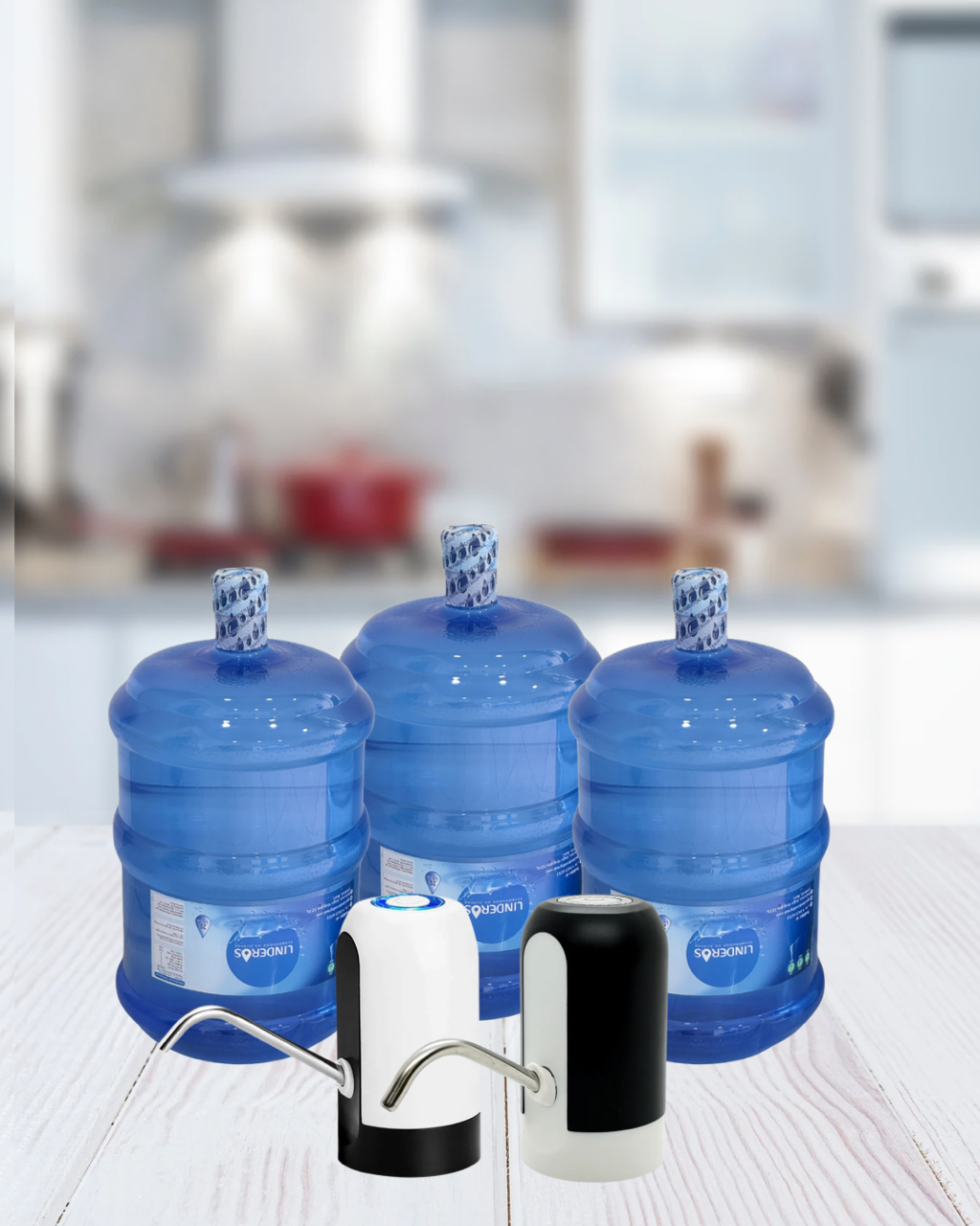 Pack inicial USB que incluye 3 bidones (3 envases de 20 litros)+ 3 recargas de 20 lts (total 60 lts) + dispensador de agua USB.